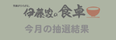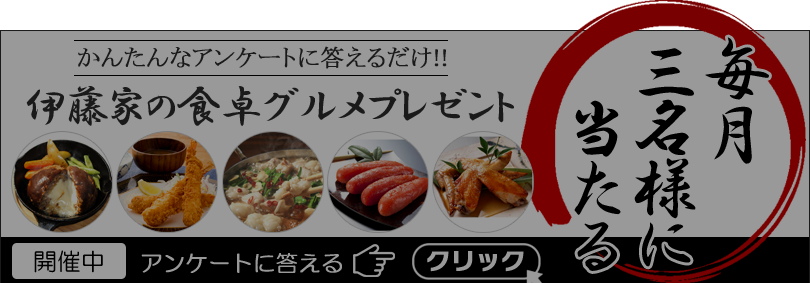 毎月抽選で素敵なプレゼントが当たる!!伊藤家の食卓アンケートキャンペーンへようこそ! ◎下のアンケートバナーをクリック するとアンケートページが開きます。 アンケート送信後画面が切り替わりませんので、<または×でページを閉じ トップページにお戻りください。 ◎プレゼントの内容は毎月変わります。 今月のご当選者様並びに来月のプレゼントは下記のバナーからご確認ください。 ご協力ありがとうございました。